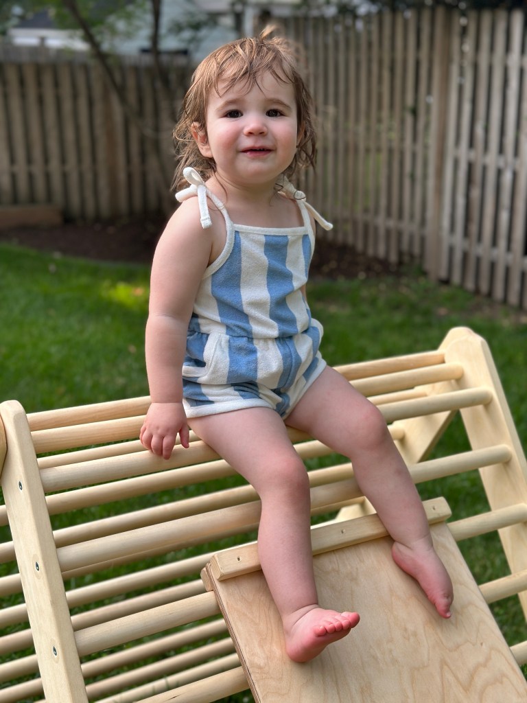 When Chloe was a baby, she was slightly delayed when it came to crawling. Then, when it was time to walk, she hadn’t quite figured it out and we were a bit concerned we may have to seek out some therapy to catch her up. Looking at her now, you’d think this was a completely different child. Chloe not only walks and runs with ease, but she is a master climber. She can climb out of her crib despite all obstacles we put in her way (more on that later), as well as any object, tower or playset that she comes across. At the playground, she insists on going to the playset for older kids and going down the “big slide.” I spot her on the way up, but honestly, she’s got it down. However, given that her uncle is an expert rock climber, I suppose we shouldn’t be that surprised.