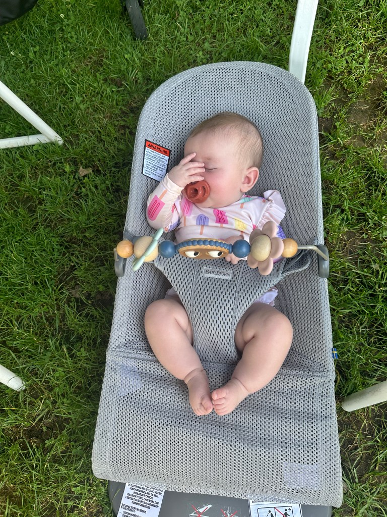 Clare didn’t swim much, but she was happy to be dipped in the pool now and then! Mostly, she spent the summer trying to roll over. She did it once early in the summer and then never again. However, now she’s doing it regularly!